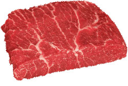 Flatiron SteakThe Flatiron steak encompasses the infraspinatus muscles of beef, and one may see this displayed in some butcher shops and meat markets as a "top blade" roast. Steaks that are cross cut from this muscle are called top blade steaks or patio steaks. As a whole cut of meat, it usually weighs around two to three pounds; it is located adjacent to the heart of the shoulder clod, under the seven or paddle bone (shoulder blade or scapula). |