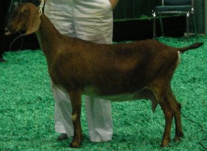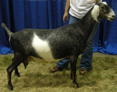 Nubians have very long floppy ears that should extend about 1 inch beyond the muzzle. They can be any color and should have a convex (Roman) nose. Nubians are one of the larger breeds of goats with a height requirement of 30 inches weighing around 135 pounds. This breed of goat tends to produce some what less milk than other breeds, but their milk tends to be higher in protein and butter fat content than other breeds. They tend to be a little bit more stubborn than other dairy goats and make a distinctive sound. Even Nubian kids sound like they are complaining. This is probably the most popular breed of dairy goat in the US. Most Nubian goats in the US derive from English lines developed by crossing English dairy goats with African and Indiana lop-eared breeds. [ADGA averages for 2010 lactations: 1835 lbs milk, 4.6% fat, and 3.7% protein]