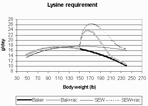 The model can predict the weekly lysine requirements for feeding different levels of Paylean. Pigs fed 9 g/ton of Paylean do not have as high predicted lysine requirements as pigs fed 18 g/ton Paylean. The maximal increase in dietary lysine percentage is 50 to 58% for gilts fed 18 g/ton Paylean and 32 to 37% for pigs fed 9 g/ton Paylean (Table 3). The model indicates that producers should consider phase feeding with 2 or 3 diets of different % lysine with either the 9 or 18 g/ton levels of Paylean.