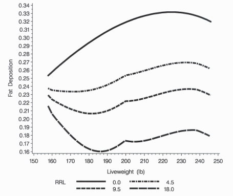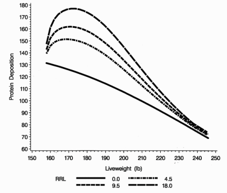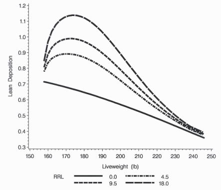 A function was developed to account for the increased fat-free lean gain relative to empty body protein gain as a function of the level of Paylean and relative ractopamine response (RR). New equations were developed to predict the 10th rib fat depth and loin eye areas from the modeled carcass and fat-free lean weight. The compositional growth of gilts fed Paylean was predicted for gilts reared in two environments: (1) SEW, high health management in modern facilities and (2) an older continuous flow facility (Kendall et al., 2000). Compositional growth curves were developed from serial real-time scans and live weights. The Paylean response was modeled for four levels of Paylean, 0, 4.5, 9 and 18 g/ton level from 150 to 240 lbs live weight. The predicted values assume that dietary levels of essential amino acids are adequate for maximum Paylean response.