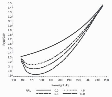 Lean feed conversion is the pounds of feed required per pound of fat-free lean gain (Figure 7). Again, the model assumes minimal feed wastage, thermal neutral conditions and nonlimiting dietary levels of essential amino-acids. Lean feed conversion is substantially improved by the feeding of Paylean as the rate of fat-free lean is increased overall and to a lessor extent feed intake decreased. In the gilts not fed Paylean, lean feed conversion increased as the ratio of fat-free lean gain to carcass fat gain decreased.