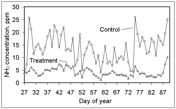 Daily mean NH3 concentrations in the pits averaged 4±0.4 and 14.3±1.3 ppm in the treated and control buildings, respectively. Daily mean NH3 concentrations in the chimney averaged 4.3±0.4 and 13.7±1.4 ppm in the treated and control buildings, respectively. The pit/chimney ratios of daily mean NH3 concentrations were 0.93 and 1.04 in the treated and control buildings, respectively. In the treated building, NH3 concentrations were greater in the outlets because the NH3 reducing chemical had greatly reduced the fraction of the total ammonia produced that was from the pit. A greater portion of the total ammonia produced was derived from above the floor as compared to the control room.