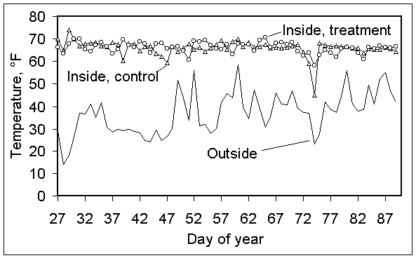 The results presented in this paper were obtained from experiments during 63 days, from January 27 to March 30, 1997. Data from the treated building and control building are compared in Table 1 and Figures 4-9. Table 1 provides the basic statistics of environmental parameters, gas concentrations, gas emission rates and airflow rates during this period of time.