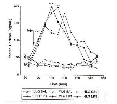 Cortisol, a hormone induced by stress, acts to partition nutrients away from muscle and adipose tissue to allow the animal to cope with disease stress. LPS significantly increased cortisol concentrations in the three genetic lines (Figure 5). With the exception of one time point, there was no significant difference between genotypes in cortisol concentrations following the saline or LPS injection. LPS injection also caused a reduction in glucose concentration in all three lines compared to basal concentrations (Figure 6). This reduction was much more profound in the LLG pigs (P<.05). The reduction in blood glucose that occurs following an immune challenge in rodents has been attributed to a decrease in glucose production and output by the liver, and an increase in glucose uptake by tissues containing high numbers of immune cells. One study found higher glucose uptake in tissues of rats with increased tolerance to an LPS challenge (Spolarics and Spitzer, 1995). It is possible that the greater reduction in blood glucose concentrations in the LLG pigs is due to a higher level of glucose uptake into peripheral tissues, making this line more tolerant to the LPS injection. Other researchers have obtained similar reductions in blood glucose concentrations using slightly lighter pigs (130 to 200 lb) and a slightly lower dose of LPS (20 mg/kg BW). In these pigs, blood glucose concentrations decreased between 2 and 4 hours after the challenge (Myers et al., 1997).