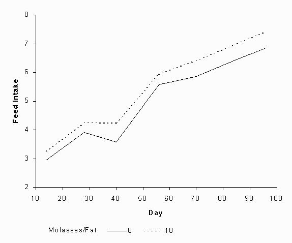 Figure 1 shows the uniform increase in feed intake of pigs receiving the Molasses/Fat combination. With the extremely similar metabolizable energy of all four diets, the intake data support the flavor or appetite enhancing benefits attributed to molasses in swine diets. Table 4 demonstrates that the increased feed intake by pigs receiving the Molasses/Fat product, which was almost one-half pound per pig per day, was sufficient to more than compensate for the difference in dry matter, such that the pigs on the Molasses/Fat product consumed 0.25 lb more dry matter than did the control pigs.
